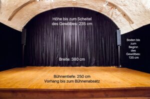 Die kleine Kellerbühne hat eine Breite von 380 cm, eine Tiefe von 250 cm und eine Bogenhöhe, die sich zwischen 135 cm und 235 cm bewegt. Mit diesen Abmessungen bietet die Bühne einen intimen Raum für Auftritte und Darbietungen.